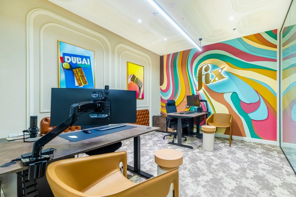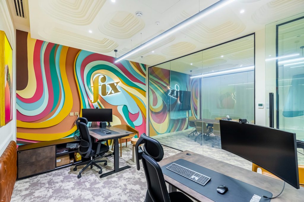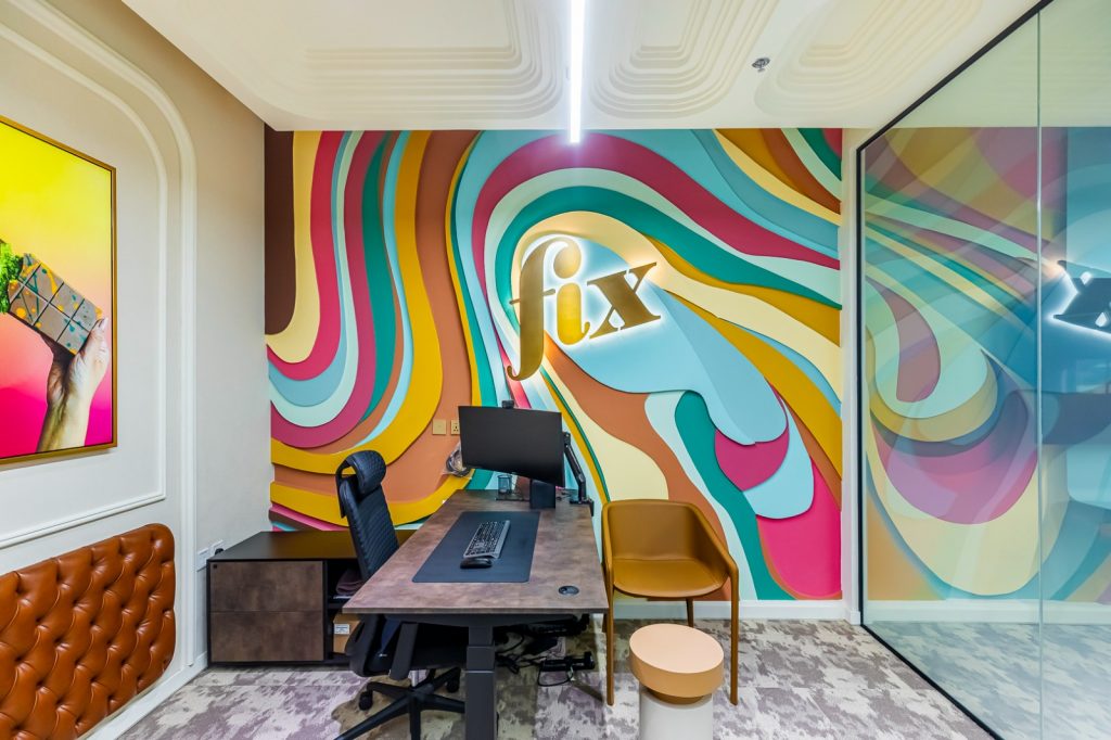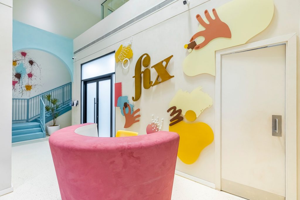 Fix Dessert Chocolatier, the original Dubai chocolate, engaged us to design their new office and kitchen spaces in line with their premium identity. Our team created a professional yet playful office environment with vibrant tones and clean lines. For the kitchen, we focused on durability and functionality, ensuring a practical setup for day-to-day operations in a commercial setti