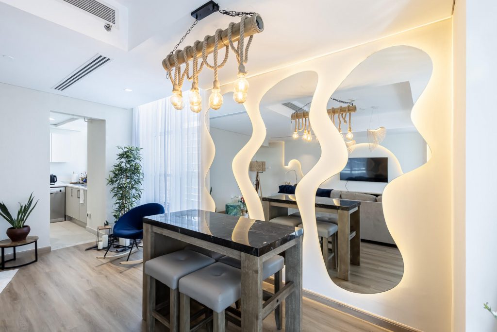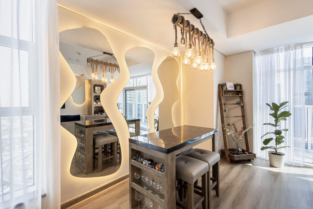 We used strategically placed contemporary mirrors, to enhance the illusion of there