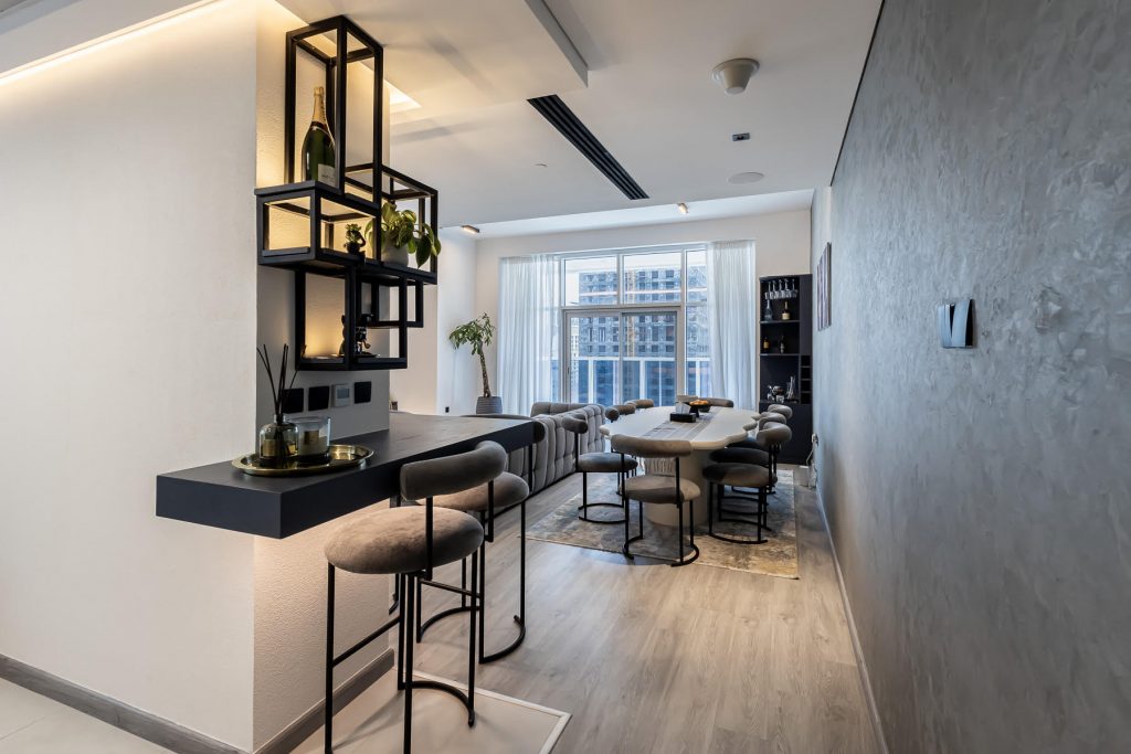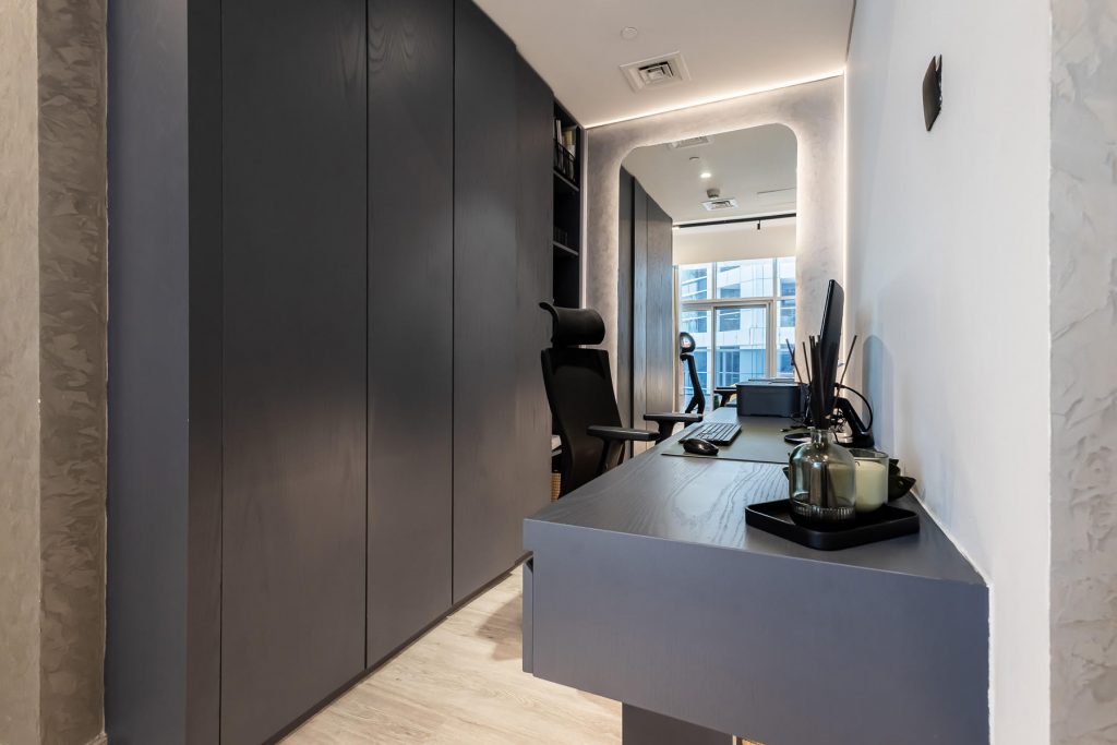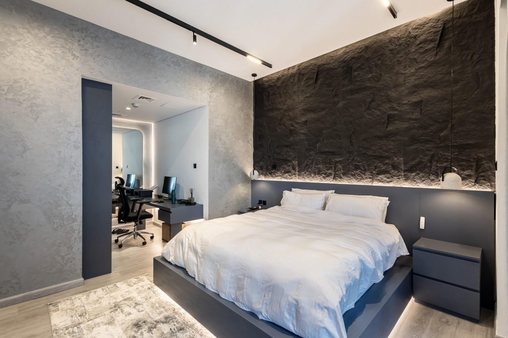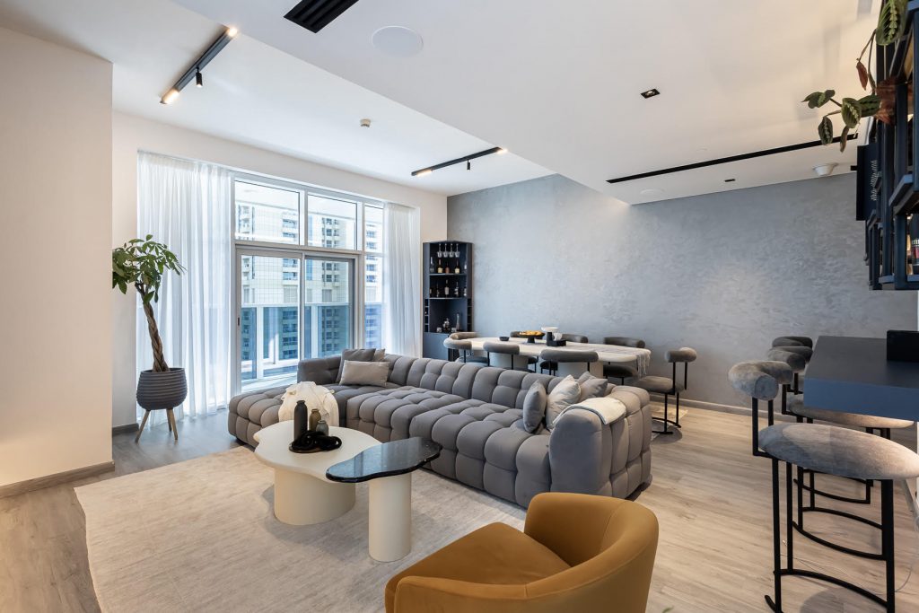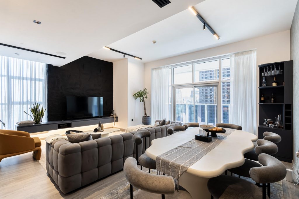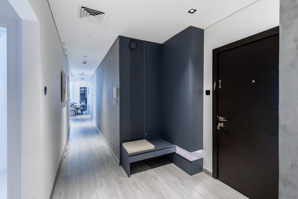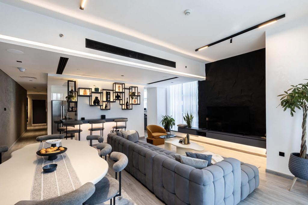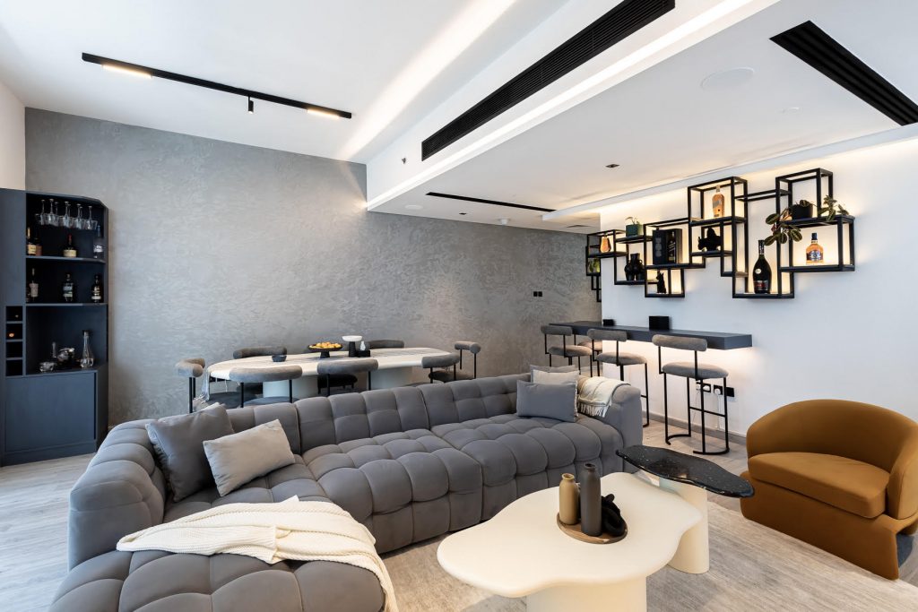 Our client desired an interior refresh for their 2 bedroom apartment, including new furnishings to enhance the comfort and style of the space. The interior design project entailed creating an in-trend color combination in the living space, using contrasting colors to create a more intimate living space. We selected high-end, stylish furnishings, including an expansive seating area to utilise the available space. In the bedrooms where the space was more limited, we chose space optimizing fittings and a light color scheme to brighten the rooms.